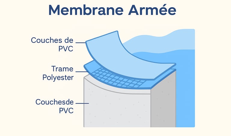 La membrane armée (ou liner armé) est un revêtement composé de deux couches de PVC souple renforcées par une trame polyester. Épaisse de 1,5 mm (soit 150/100e), elle est soudée sur place, épousant parfaitement la forme de votre piscine béton monobloc.